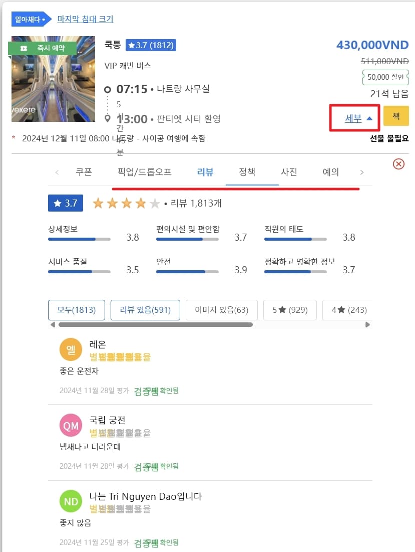 위에서 소개한 한 카페의 경우 이 Vexere에서도 예매 가능합니다.
