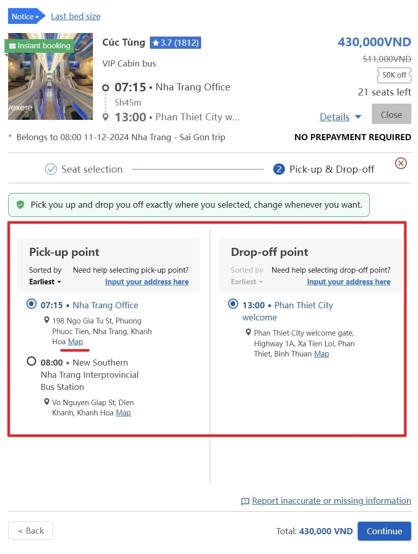 원하는 좌석을 선택 후 진행하면 원하는 픽업 (승차) 장소와 드롭 (하차)를 선택할 수 있습니다. MAP 버튼을 누르면 구글 맵에서 바로 확인 가능합니다.