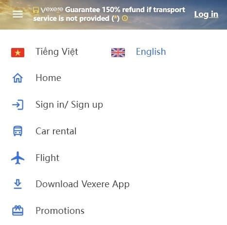 Vexere에 접속 후 모바일에서는 왼쪽의 메뉴 아이콘을 선택할 수 있고, 데스크탑에서는 오른쪽 위의 국기 아이콘을 클릭하시면 됩니다.