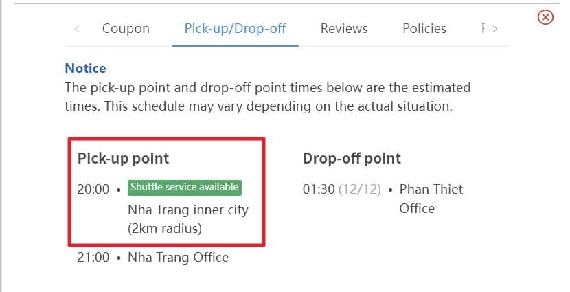 회사에 따라 조그만한 밴을 이용해 승객이 있는 위치까지 데리러 오는 서비스를 지원합니다. 위 경우는 나트랑 시내 중심가에서 2km 반경의 경우 셔틀 서비스가 제공된다는 뜻입니다.