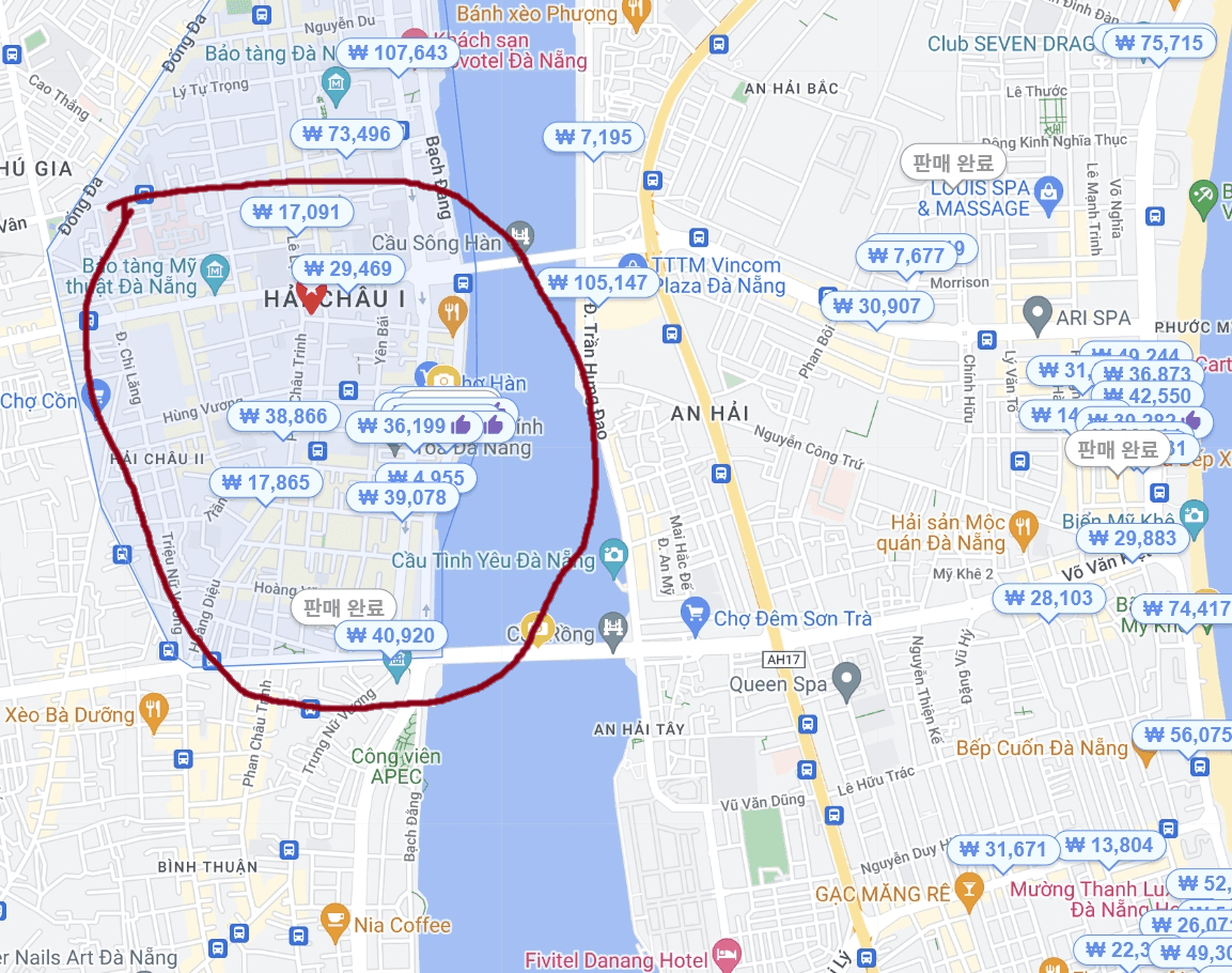 이 지역은 위에서 설명한 다낭의 시내이자 최대 번화가 지역입니다. 공항에서부터 접근성이 매우 뛰어날 뿐더러 호텔의 평균 가격대도 해변에 비하면 높게 형성되어 있습니다.