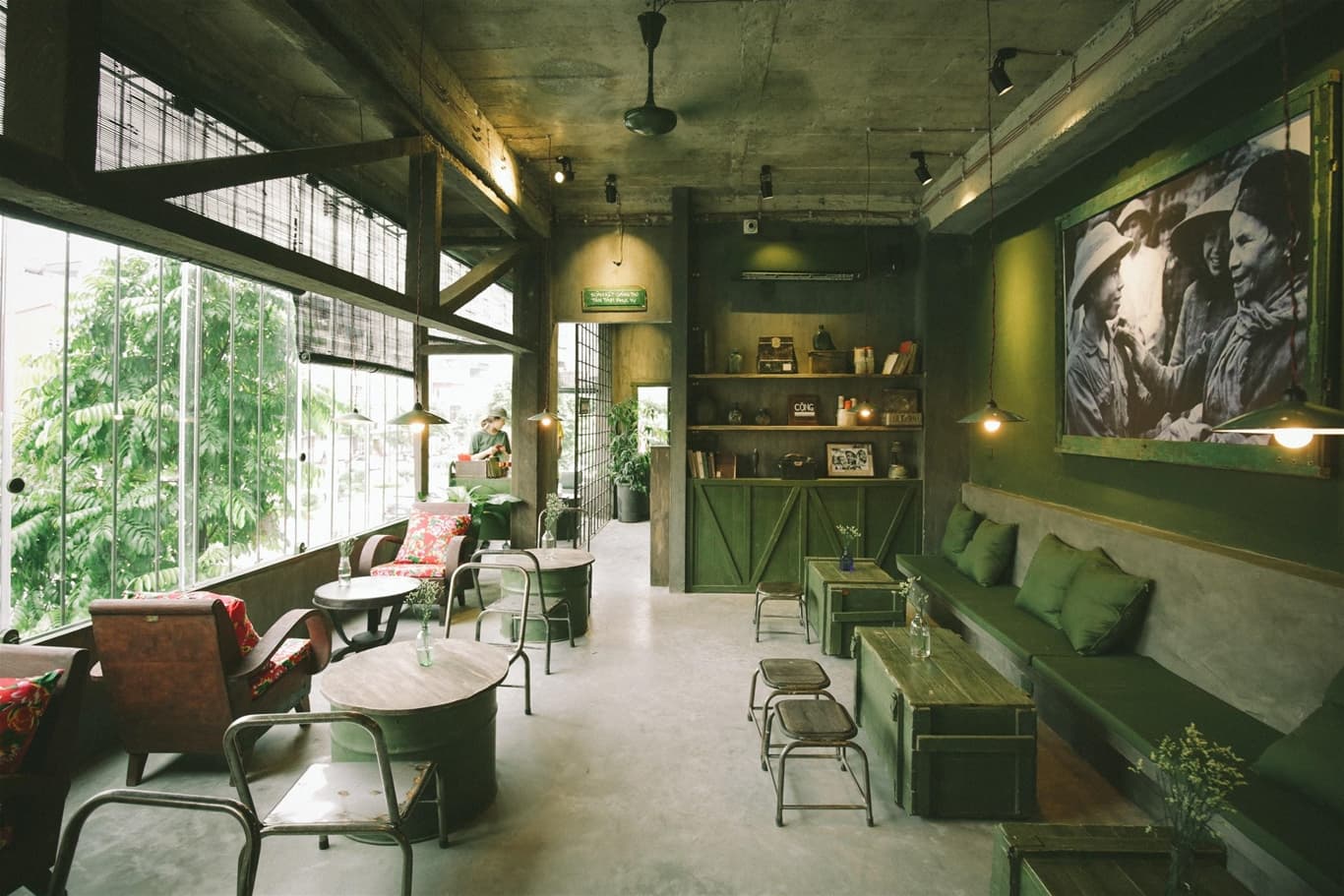 국방색을 메인 컬러로 사용하고, 낡고 빛바랜 가구, 당시의 흑백 사진, 촌스러운 꽃무늬 천으로 만든 방석, 심지어 일부러 벗겨낸 페인트까지, 곳곳에서 그 시절의 분위기를 그대로 재현했습니다. 직원들 역시 당시 군인들이 입던 것과 비슷한 국방색 유니폼을 입고 있어, 마치 시간 여행을 온 듯한 독특한 느낌을 줍니다.