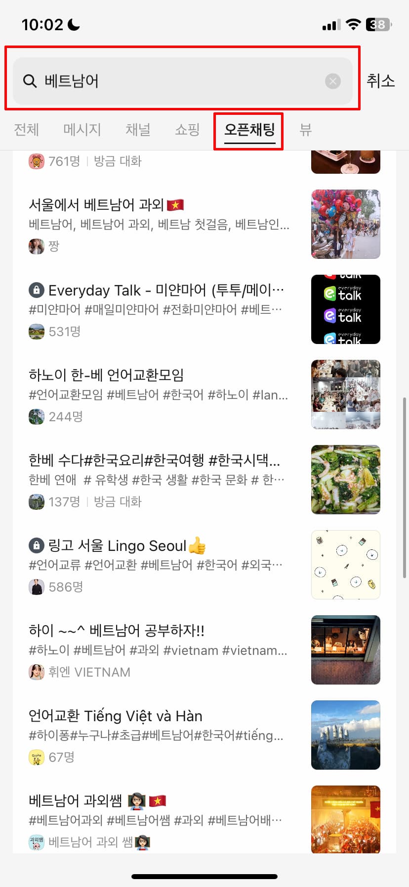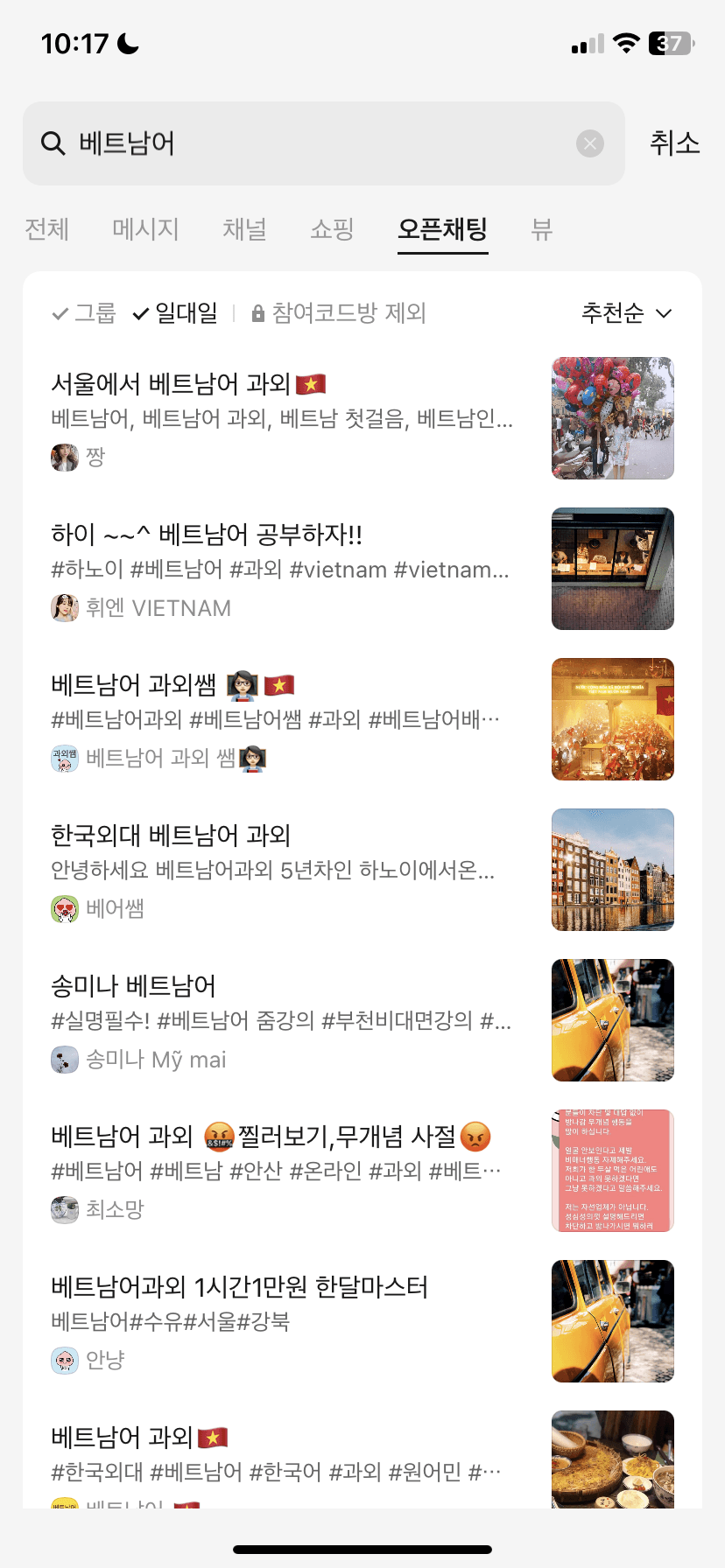 - 카카오톡 오픈 채널 > 베트남어 검색 > 베트남어에 관한 단체 그룹 및 대화에 참여