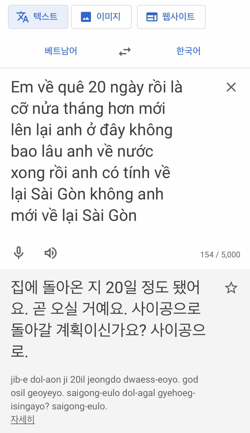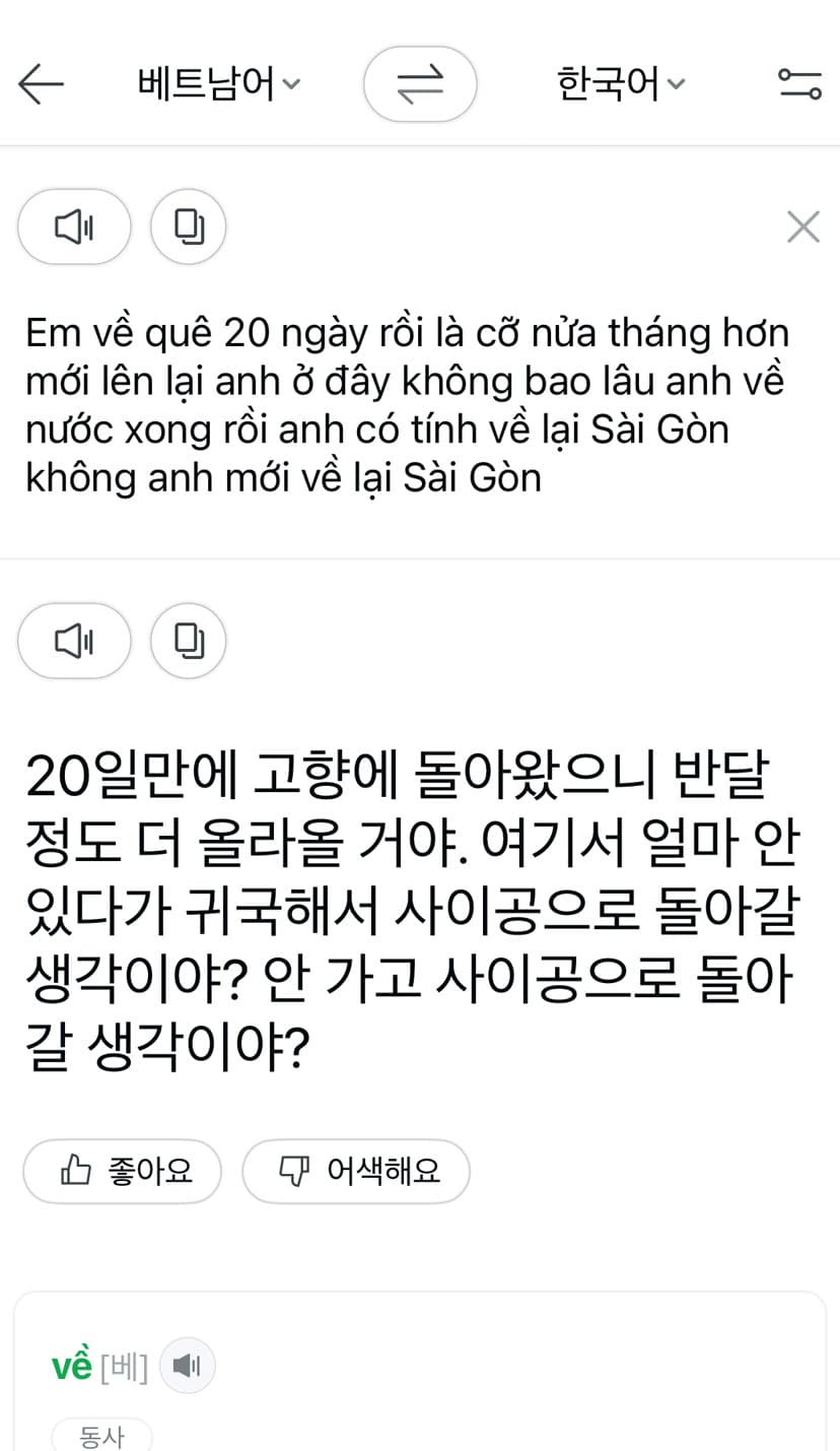 위는 주고받은 메시지 일부를 두 번역기로 비교한 결과인데, 둘 다 의미를 이해하기 어려웠어요. 대략 의역하자면 “내가 고향에 20일 정도 갔다왔는데, 너는 (호치민에서) 얼마 안 있다가 (한국으로) 귀국했다. 호치민에 돌아올 계획 있나요?” 정도 됩니다.