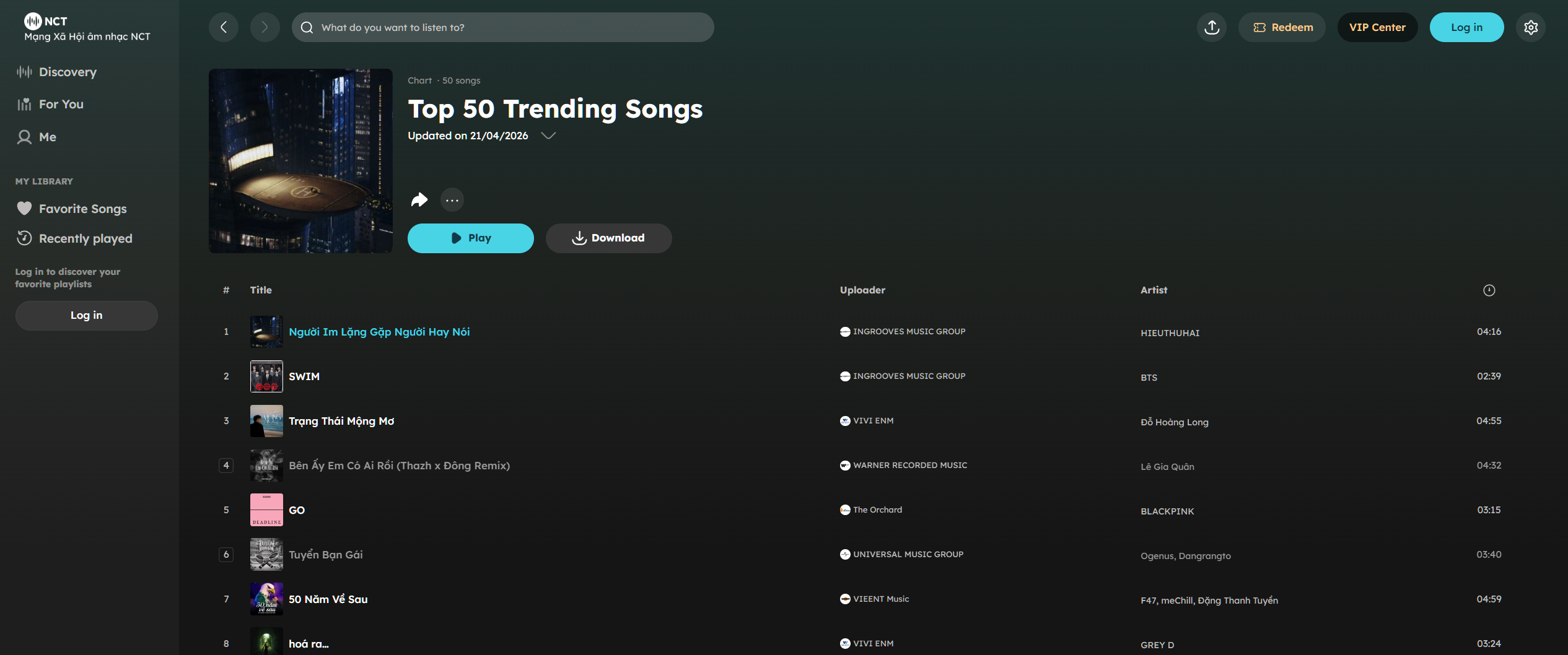Nhaccuatui(NhacCuaTui, 줄여서 NCT)는 한국에서도 지역 제한 없이 접속 및 스트리밍이 가능한 베트남 현지 음악 플랫폼입니다. 스포티파이에 비해 인터페이스가 단순하고 한국어를 지원하지 않지만, 로그인 후 기본 음질(128kbps)의 MP3 파일을 무료로 내려받을 수 있다는 점이 가장 큰 강점입니다.