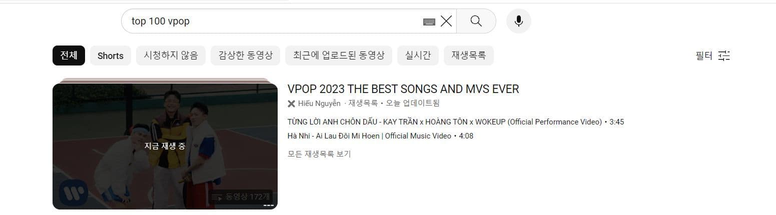 베트남 노래를 인기 순위로 가장 편하게 듣는 방법은 유투브에 “top 100 vpop” 이라고 검색하는 겁니다.