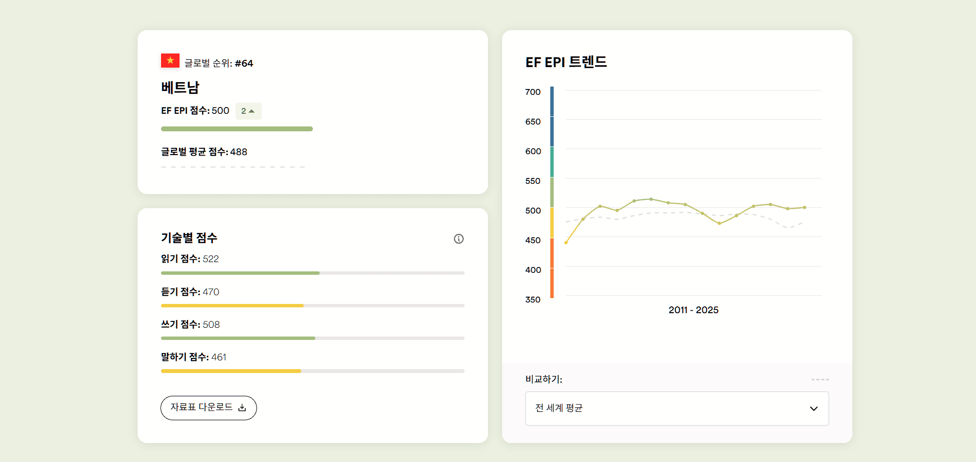 베트남은 전 세계 국가 중 중위권에 해당하는 순위를 유지하고 있습니다. 이는 아시아 내에서 상위권에 속하는 지표이며 한국과 비교해도 크게 뒤처지지 않는 정도의 숙련도를 보여줍니다.