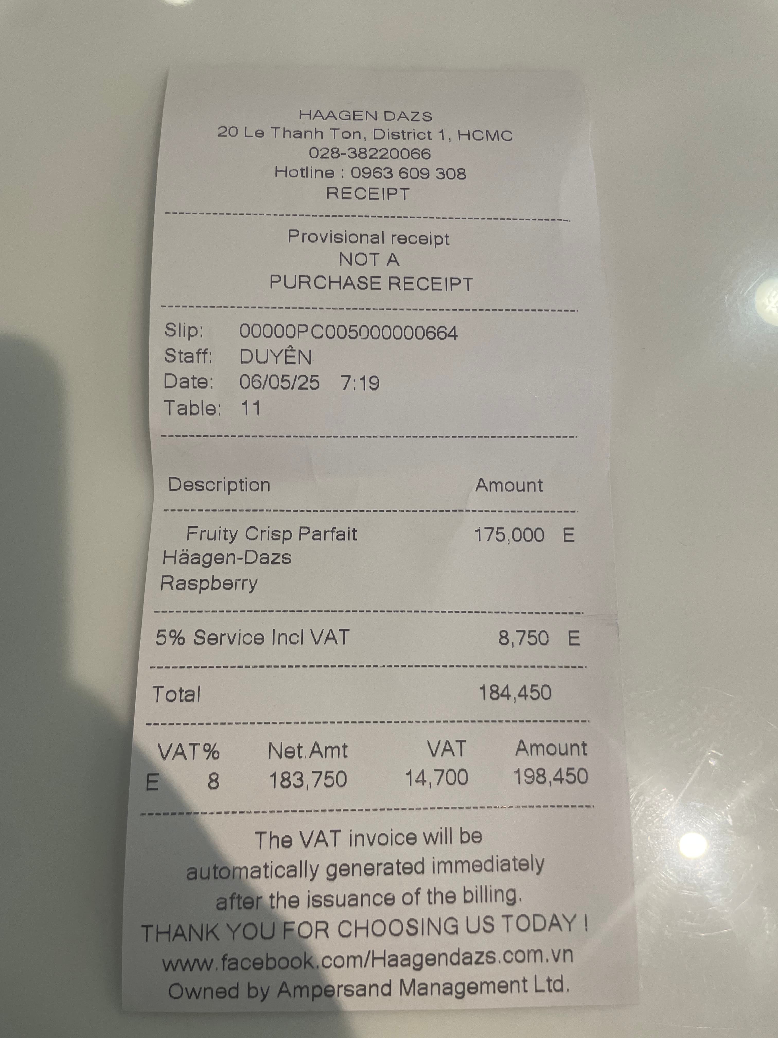 호치민 하겐 다즈의 영수증. 5% 서비스 차지에 8% VAT까지 따로 꼼꼼하게 받아먹는다.