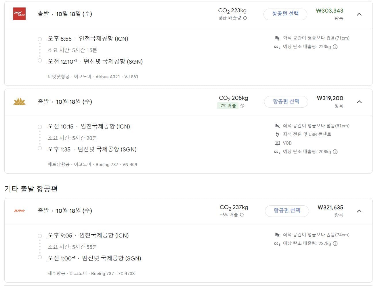 베트남은 한국으로부터 겨우 4~5시간 거리입니다. 미국이나 유럽처럼 장거리 노선이 아닌 경우 가격 차이가 크지 않습니다.