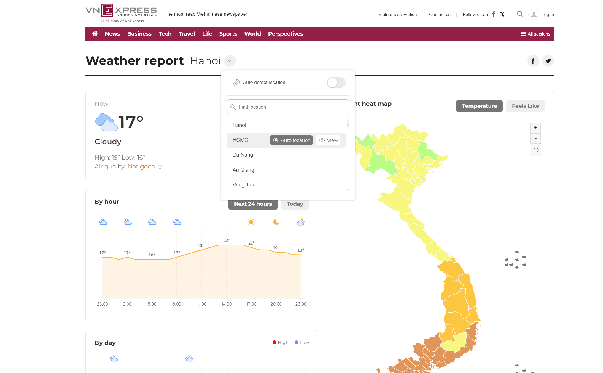 위에서 소개한 베트남 기상청 웹사이트가 사용하기가 어려우시다면, 베트남 최대의 온라인 뉴스 포털인 vnexpress의 날씨 섹션을 이용해볼 수 있습니다.
