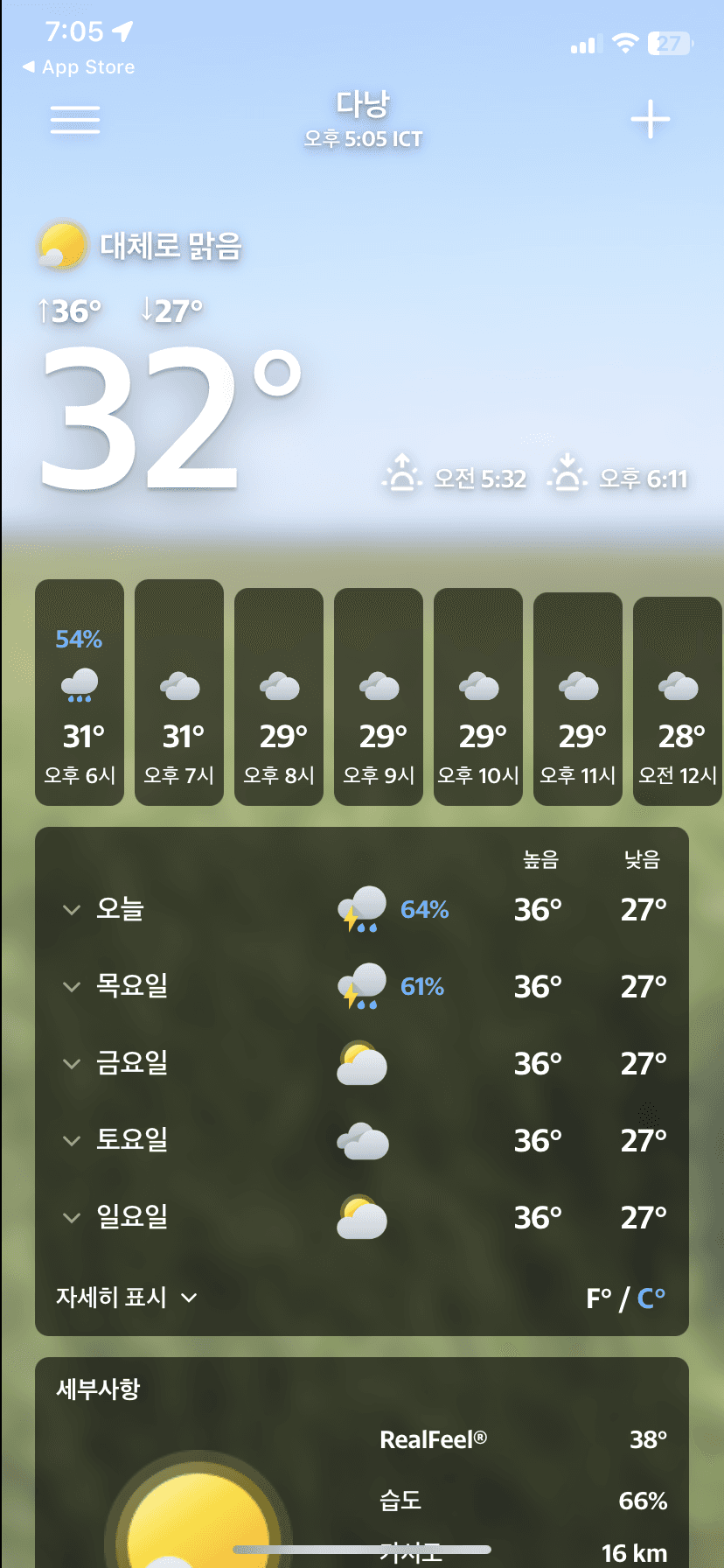 비록 베트남어로만 제공되지만 온도와 강우량 등을 아이콘으로 표시되어 있어서 알아보는데 불편함은 없습니다.