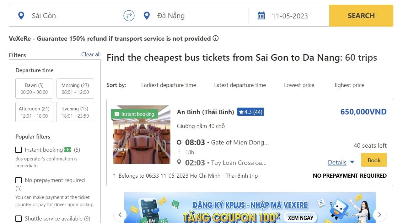 Vexere에서 버스 선택 시 팁