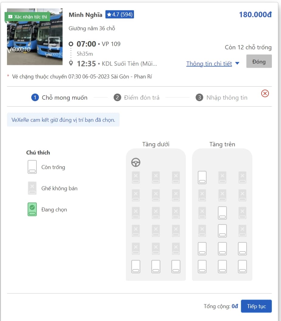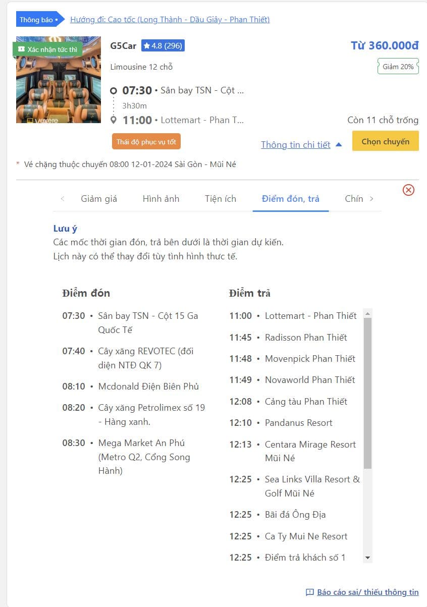 혼자 이동하신다면 Vexere에서 최초 출발지가 “Sân bay TSN Quốc Tế” 를 제공하는 업체를 선택하세요.
