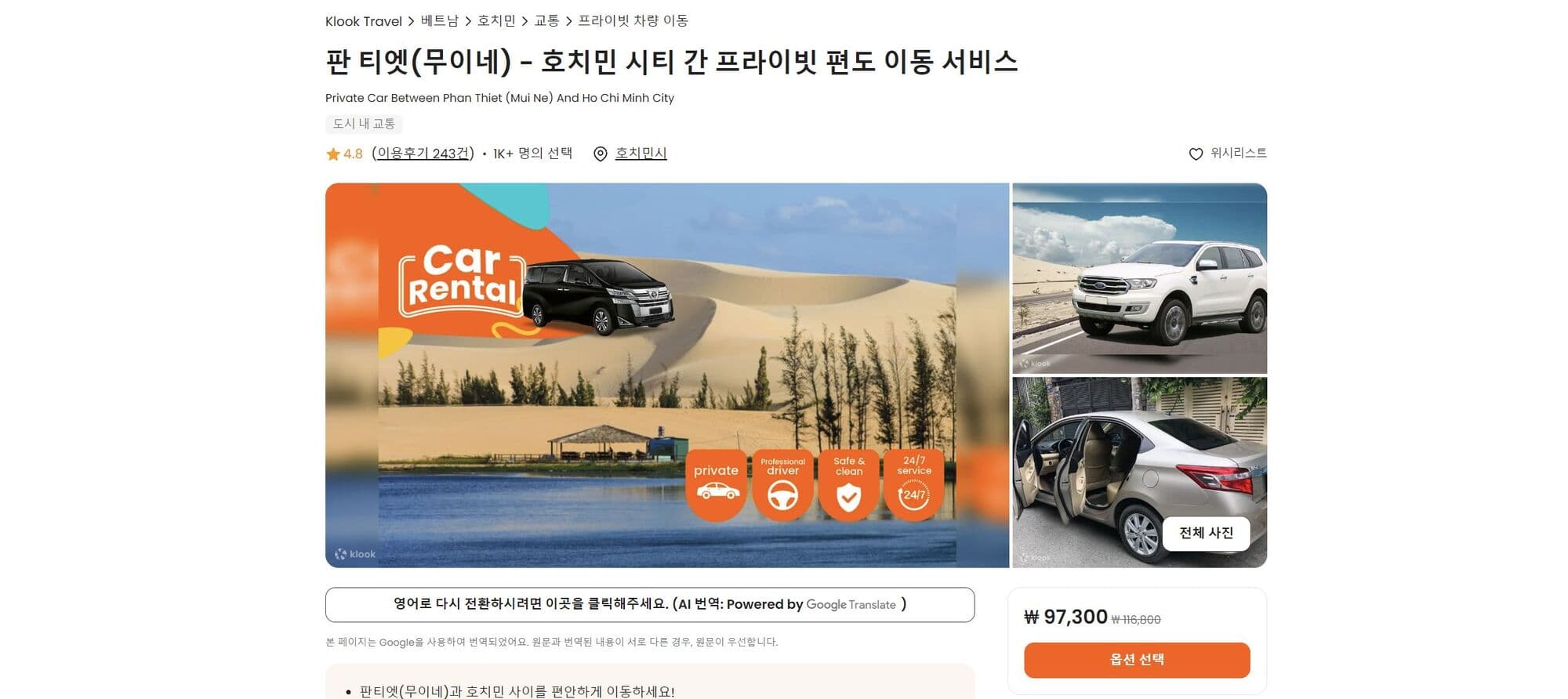 가격은 비싸지만 편하게 호치민에서 무이네까지 이동하기 위해서는 프라이빗 카 서비스를 이용할 수 있습니다.