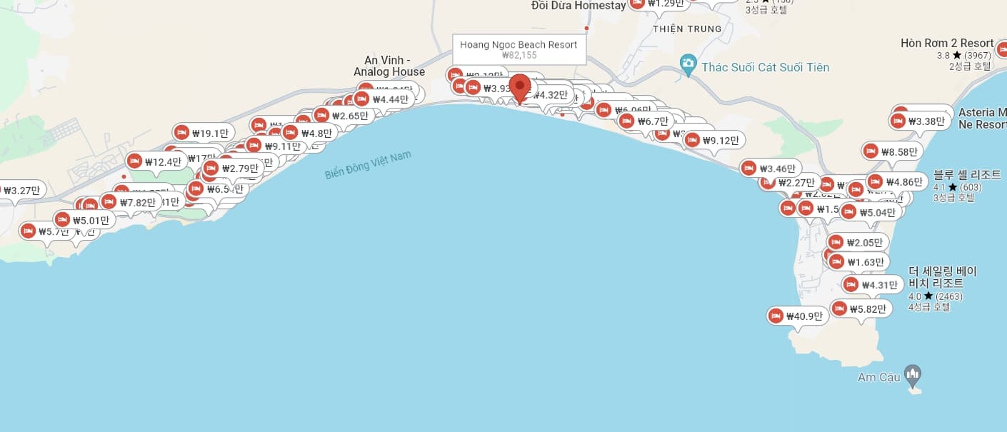 판티엣부터 무이네까지는 약 27km 떨어져 있으며 전혀 가깝지 않으며, 호텔 또한 긴 해안선을 기준으로 아주 넓게 분포되어 있습니다.