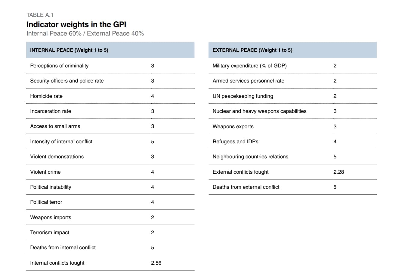 이 GPI는 정치, 테러, 주변국과의 관계, 수감자, 살인 건수, 무기 소지율, GDP 대비 군사비 지출 등 매우 다양한 지표를 통해 해당 국가가 얼마나 “평화적”인지를 나타냅니다.