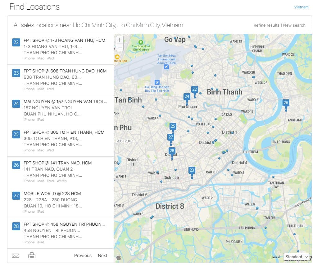 애플의 공식 홈페이지에서 베트남의 도시 명을 영문으로 입력하면 해당 도시의 모든 판매점을 확인하실 수 있습니다.