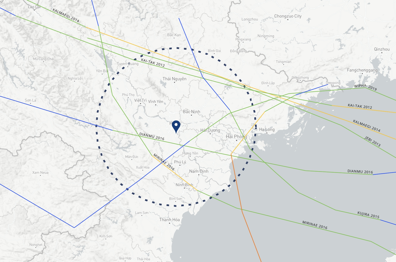 Based on frequency, this averages about 0.8 typhoons per year. However, since 2012 and 2016 each had 2 typhoons, it’s more accurate to say Hanoi experiences significant typhoon impact roughly every 2 years.
